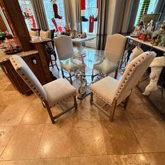 48” R Hand Forged Iron Base with a beveled edge glass top, which does have a chunk out of the side, which can be seen in picture. It is 31 inches tall. Does not come with chairs!