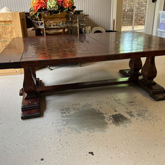 Hekman Havana Servant Solid Wood Coffee Table. Model #81228. Constructed of mahogany solids and veneers. Antique finish and diamond match mahogany veneer on top is surrounded by solid mahogany bands. Wood is heavily distressed. Base is detailed with a trestle feature. Minor wear. 43” D, 59” W, and 20” T.