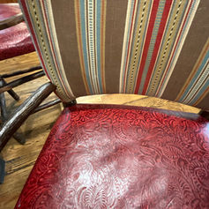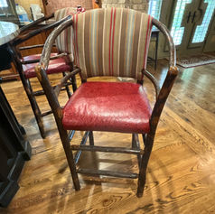 Excellent condition - Upholstered back with cranberry leather seat. They are 47” T, 25” W, and 20” D. Arm height is 42”, 31” from the floor to the seat, 19” from the footrest to the seat, 18” seat depth, and 17” seat width. Barstools are for sale new for $1800 +++ new each as seen in picture.