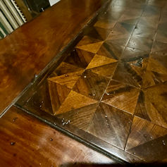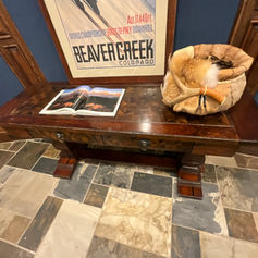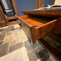 Hekman Havana Library/Console Table. Constructed of mahogany solids and veneers. Two Drawer Trestle Library/Console Table with Lionheads Motif’s -Antique finish and diamond match mahogany veneer on top is surrounded by solid mahogany bands. - 24” D, 71” L, and 33” T. Wood is heavily distressed. Base is detailed with a trestle feature. Minor wear. And Matching coffee table is available as well for sale $400 Coffee Table 43.5 X 59 and 20” T. Will find a few scratches. - sold separately.