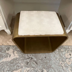 Uttermost Hoop Small Bench in off-white pleated fabric and antique gold. 16 inches deep, 24 inches wide, and is 18 inches from the floor to the seat.